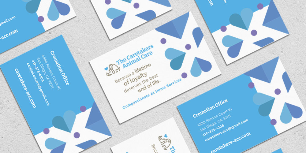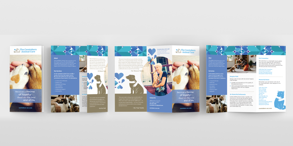 The Caretakers Animal Care needed business cards, a brochure and sympathy cards to align with their new branding which was established when we designed their website. Colors, patterns, and fonts were integrated into their print products which now reflects the compassion and uplifting nature of their business.
