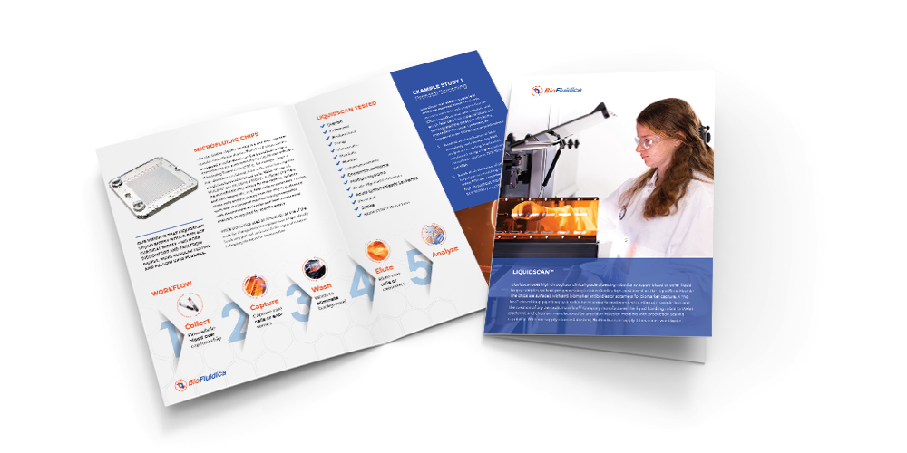 BioFluidica was in need of updated marketing materials that reflected their brand and modernized their look. They requested a Company Profile, LiquidScan Instrumentation, and Oncology Application brochures to highlight their product. Electronic and print versions were provided and displayed in their reception area as well as at their conference booths.