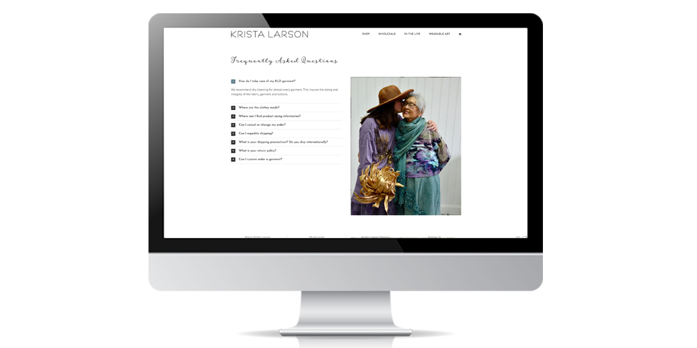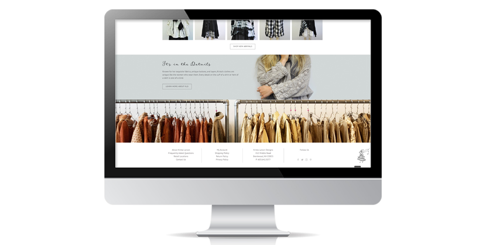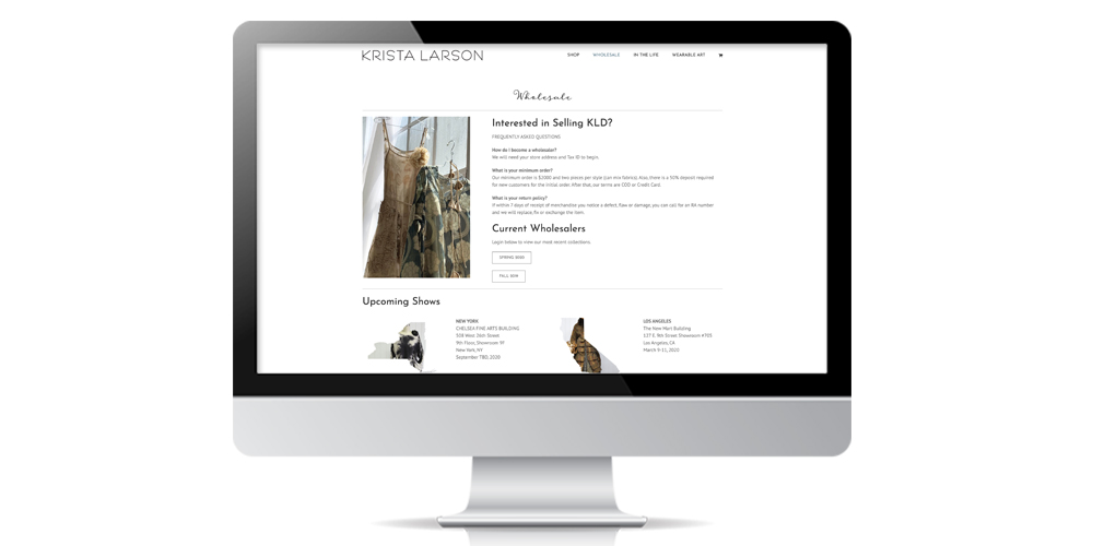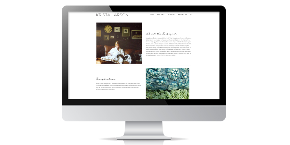 Krista Larson Designs is a fashion design business operating in New Hampshire. They have been in business for over twenty years and have an established wholesale and retail client base. When they hired Sarit + State they had a 12-year old website that was not responsive, the user was not able to check out directly through the site, and it was hard to maintain. They also had two additional sites: one that was informational that had a wholesale section and another used for a separate clothing line. We compiled all three sites into one clean and modern site for Krista that highlighted her differentiators. Now her fans can buy directly on her site and her wholesale clients can go to a secure section to view her new lines and swatches. She has had her best year for online sales in the 12 years she has been online. View the website here: https://kristalarson.com/