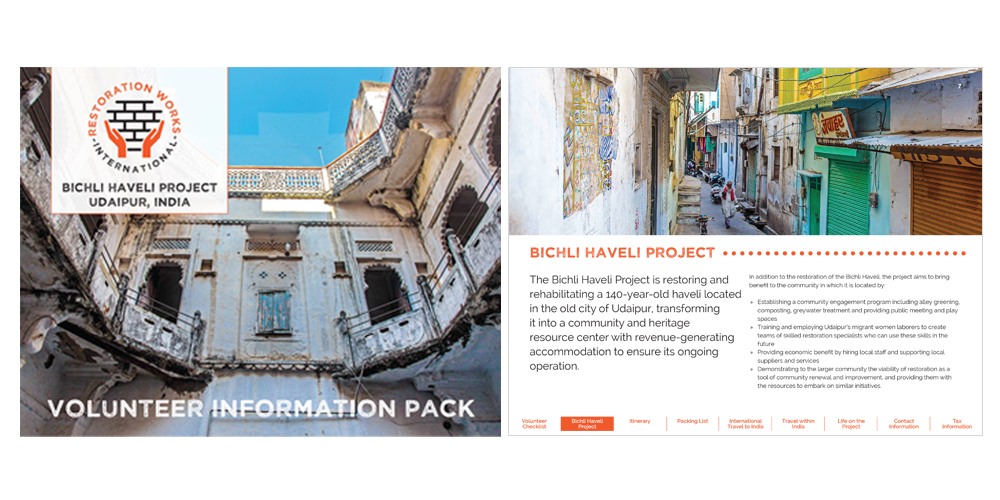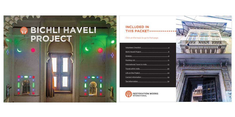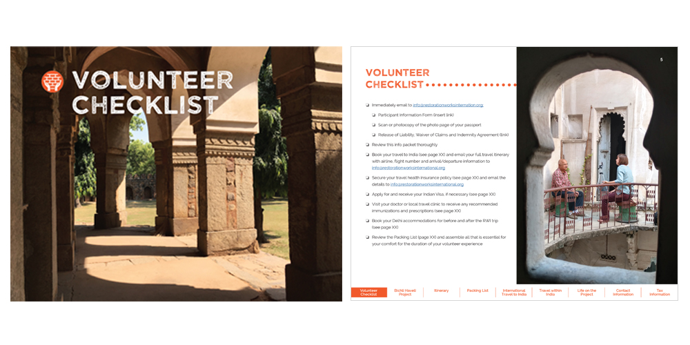 Restoration Works International (RWI) hired Sarit + State to create an updated and appealing welcome packet for new volunteers. They were supplying their new volunteers with a simple Word document and wanted to brand this new packet to match their updated logo and website (also by Sarit + State). This informational packet was setup for email purposes with the ability for RWI to edit the document for future projects.
