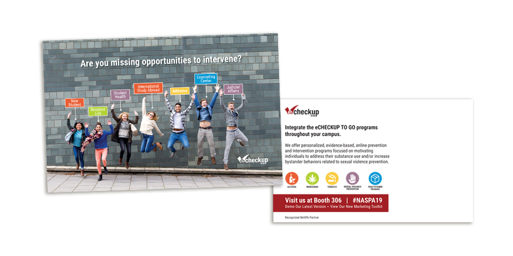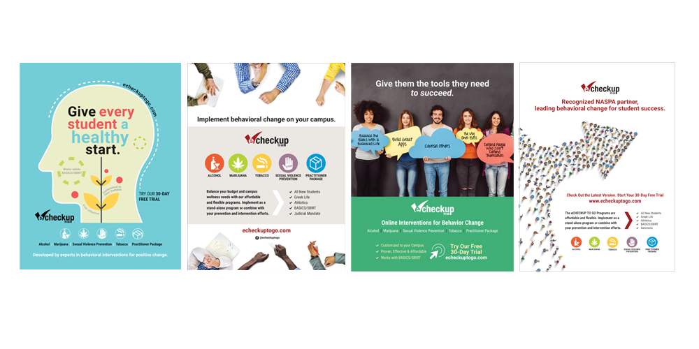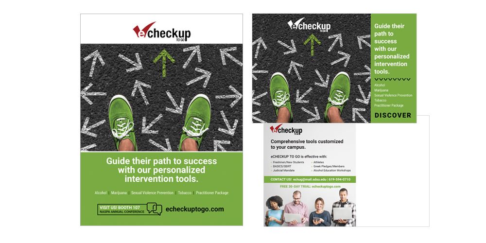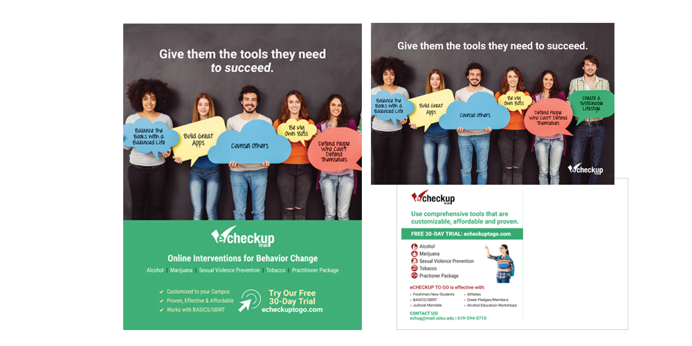 SDSU eCHECK UP TO GO is an online behavior intervention/prevention tool that is currently used at 600 college campuses worldwide. We were excited to consult on improving the user-experience of their tool as well as produce a comprehensive brochure and complimenting slideshow for use at conferences. In addition to these services, we have designed email campaigns and advertisements for publications and conference programs.